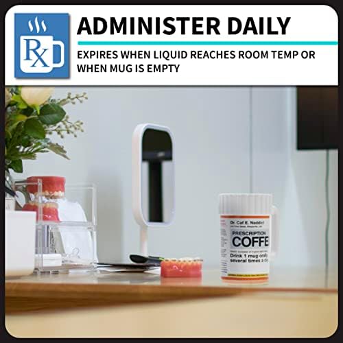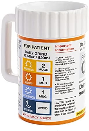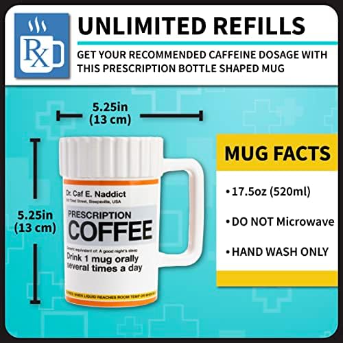 About this item DAILY PRESCRIPTION: Drink one mug of coffee orally several times a day until awake and alert or devoid of hangover. With this prescription mug, it’s the doctor’s orders! HOT AND COLD DRINKS: This cup’s durable material and cool design will brighten your day at home or the office whether you’re a coffee lover, tea fan, or hot chocolate connoisseur. Caffeine not included HILARIOUS COFFEE MUG: The perfect gift for the coffee addict, healthcare worker, nurse or doctor in your life! Includes recommended caffeine dosage and unlimited refills and comes in a full color box perfect for gifting SPECIFICATIONS: Designed to look like a prescription bottle, this oversized ceramic coffee mug is 17.5floz (520ml). Handwash only for best results, do not microwave. FUN GIFTS FOR FUN PEOPLE: For those looking for cool stuff and all things geek, crazy, and unique, we are proud to create top selling toys, mugs, collectibles, and presents that make people smile